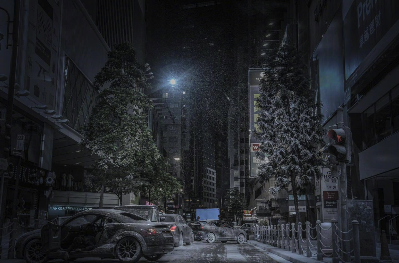麦浚龙要一场雪。拍摄过半,剧组又到实地取景,在30多度的铜锣湾,一个亚热带地区,硬生生降下一场“假雪”——大雪漫漫,凶徒持枪,漫无目的地扫视行人商铺,一场极致的混乱,便是电影的开场。
